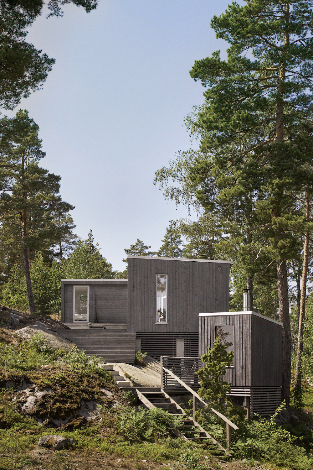 För tomten på höjden på Stora Timrarö blev lösningen ett modulhus i flera etapper, byggt i olika nivåer. En och en kunde de mindre, färdiggjorda modulerna varsamt lyftas på plats för att sedan bilda fristående hus, där arkitekturen tagit hänsyn till både platsen och naturen runt omkring.