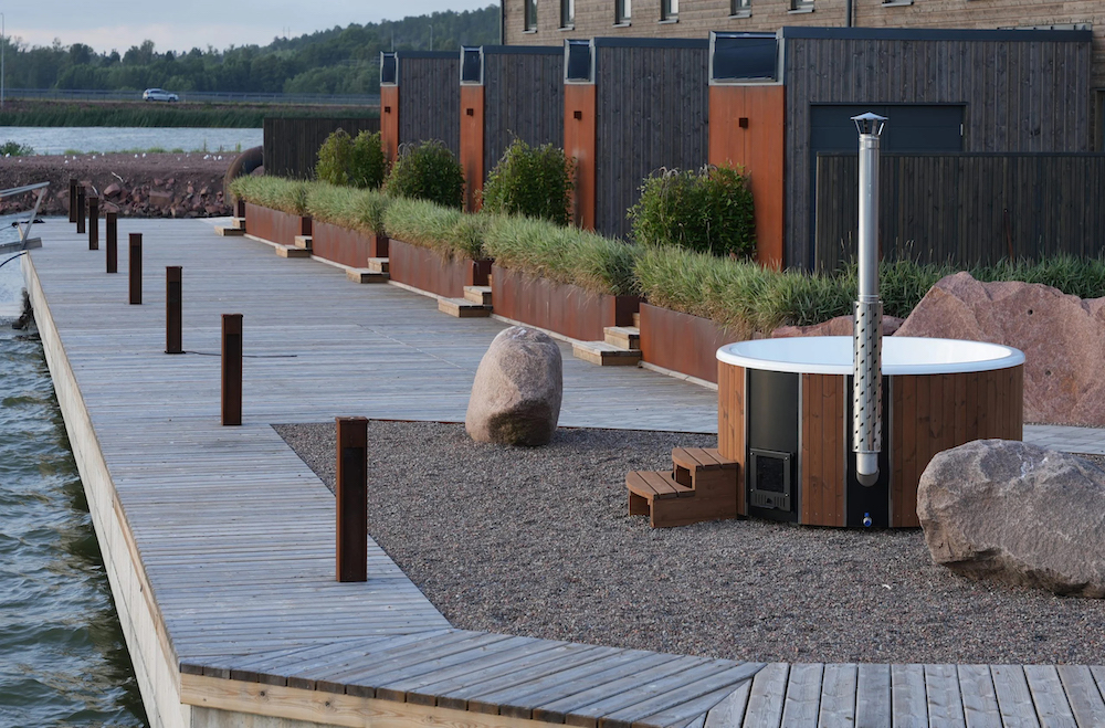 Testvinnaren har en vedeldad kamin, vilket de allra flesta föredrar eftersom doften och ljudet från brasan höjer upplevelsen. Vi noterar att kaminen är av 316-klassat, rostfritt och syrafast stål. Det är en särskilt tålig stålkvalitet som kan stå i klorerat, eller salt havsvatten, utan att ta skada. Men vattnet kan även värmas upp med el tack vare elpatronen i frostvakten, som även hindrar isbildning på vintern.