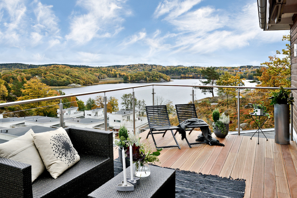 – Ibland kan räcket bidra till att avskärma och ge insynsskydd. Då kan du välja ett räcke med frostat eller färgat glas, eller ett räcke i stål eller aluminium där du kan låta växter klänga och bidra till en både mysig och skyddande miljö. Ibland vill du tvärtom bevara en vacker utsikt även om du har ett räcke, och då passar förstås klart glas. Du kan även välja en stolpfri lösning från full siktfrihet.