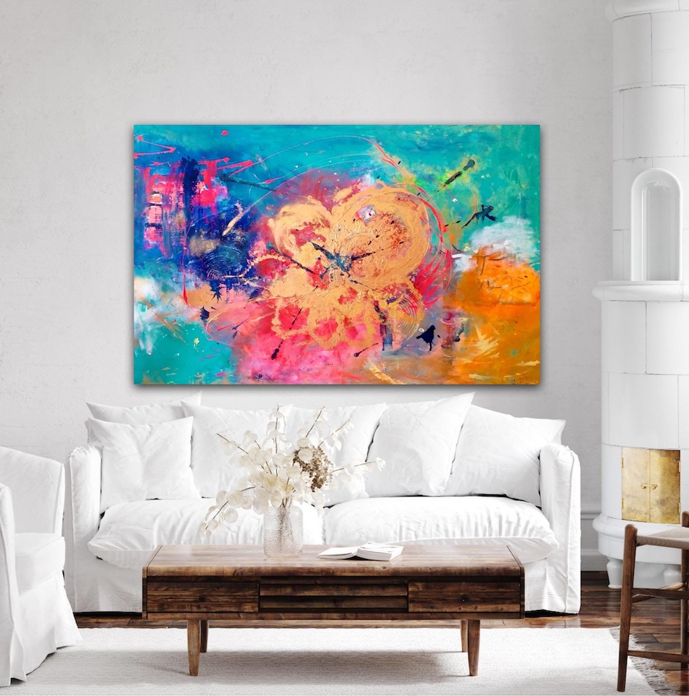 -Det handlar mycket om färgskalan som jag använder, och en livfull rörelse i flera av kompositionerna. Men även mina format, som oftast är över metern i höjd och bredd, gör att de påverkar rum och inredning. Hemmet får ett intressant blickfång. Många säger att de känner glädje och en skön energi av målningarna som hänger i deras hem.