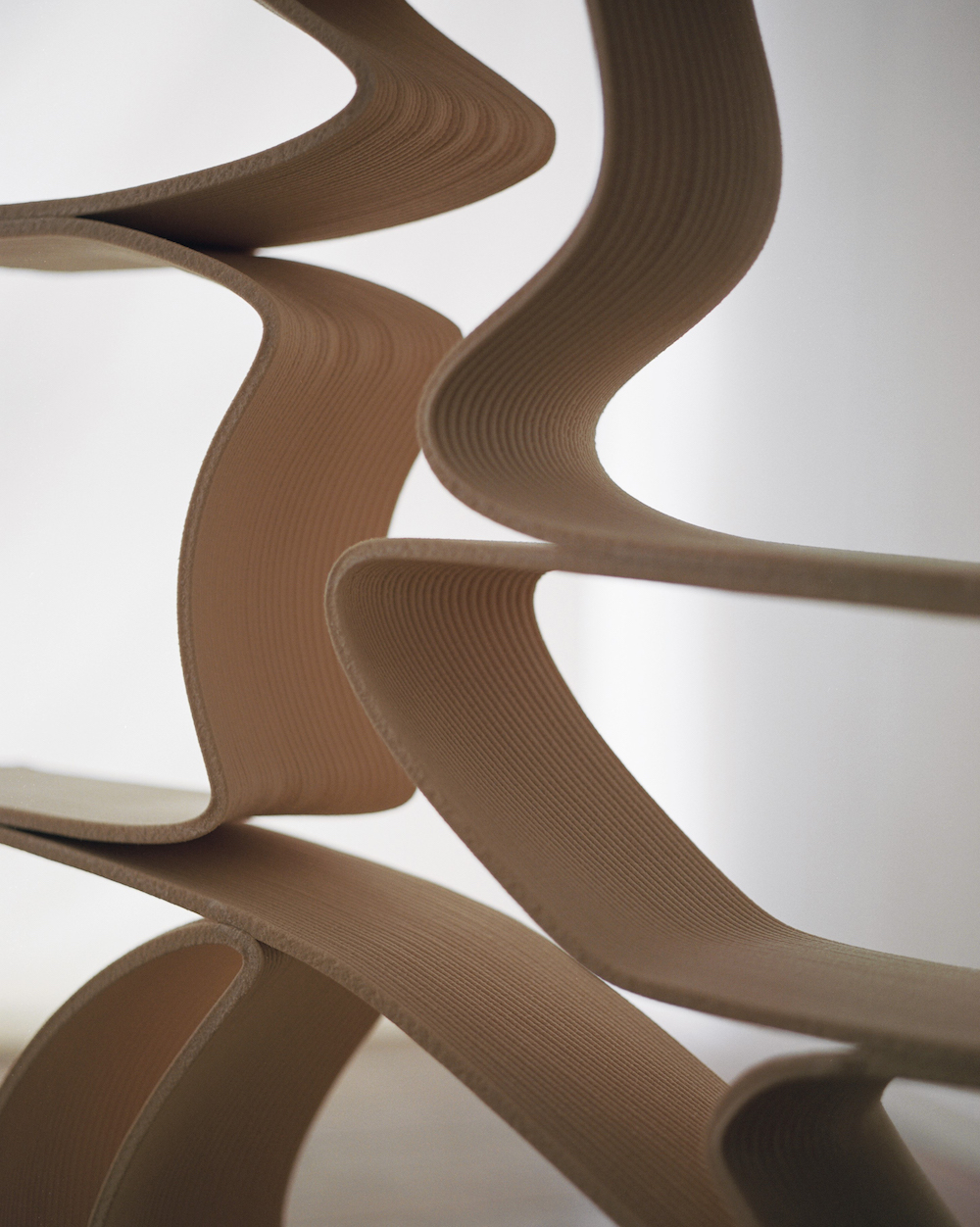 Metoden kallas för storskalig 3D-printing och bygger på att en uppvärmt massa bestående av trä, majsstärkelse och sockerrör pressas ut i tunna skikt tills en hel möbel tagit form. Tekniken innebär en cirkulär tillverkningsprocess med minimalt spill och maximal formfrihet.